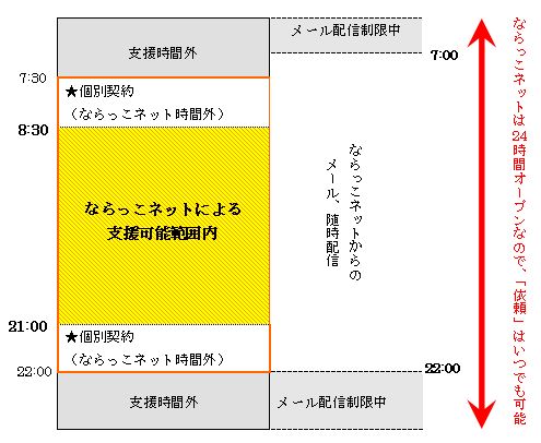 (※1)夜間22時以降に依頼を行ったものについては翌朝7時まで、メールの配信は行われません。支援をお願いできる時間帯 託児実施予定のイベント期間中 依頼登録できる時間帯 いつでも登録可能(※1) 依頼の〆切 対象イベント開始日の前日まで -