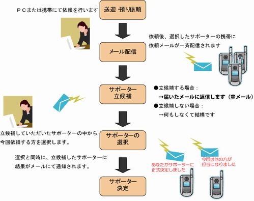 - 支援可能なサポーターは空メールを返信し、立候補します。